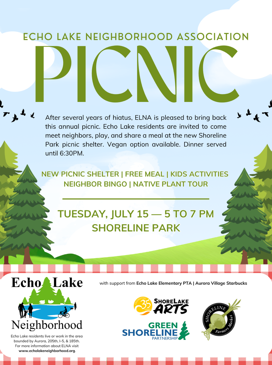 After several years of hiatus, ELNA is pleased to bring back the annual picnic. Echo Lake residents are invited to come meet neighbors, play, and share a meal at the new Shoreline Park picnic shelter.